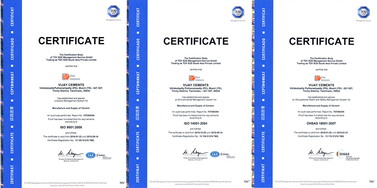 Vijay Cements is a quality producer of Portland Pozzalana Cement. The manufacturing unit of company is situated at Vellakalpatti in Trichy District, Tamilnadu, India. Our Plant has been awarded with IS 1489-Part:1-1991 Certification, IMS Certification and 5S Certification. which makes us one of the most comprehensive, holistic quality management endeavors in the category. Vijay Cements guarantees value for money, quality, cost and time for its cement products and services.